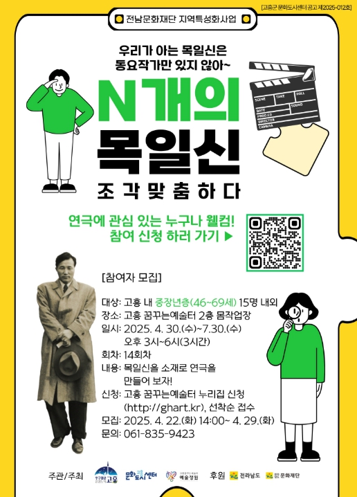 고흥 출신의 아동문학가 ‘목일신 선생’의 삶과 작품을 소재로 연극을 창작하는 이번 프로그램은 지역 내 중·장년층을 중심으로 문화예술 참여를 확대하고, 주민 간 소통과 공동체성을 높이는 데 의의가 있다.