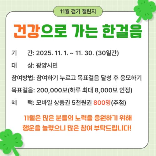 광양시, 워크온 ‘건강으로 가는 한걸음 11월 걷기 챌린지’ 운영 |