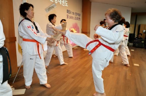 | 23일 첨단종합사회복지관에서 열린 문화예술제에서 태권도 회원들이 역량을 뽐내고 있다. |