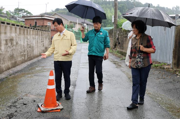 | 박병규 광산구청장(왼쪽)이 지난 8월 4일 전날 폭우로 피해가 발생한 임곡동 한 마을을 찾아 현장을 살피고 있다. |