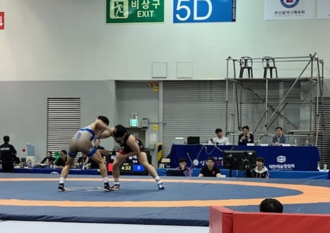 | 제106회 전국체육대회 레슬링 경기에서 정용석 선수(오른쪽)가 상대 선수와 치열한 경합을 벌이고 있다. |