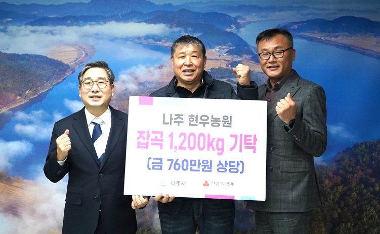 | 현우농원 최진원 대표(가운데)는 16일 어려운 이웃에게 전해달라며 강상구 나주 부시장(왼쪽)에게 백미와 찰기장·찰수수 등 1200kg을 기탁했다. (사진 제공-나주시) |