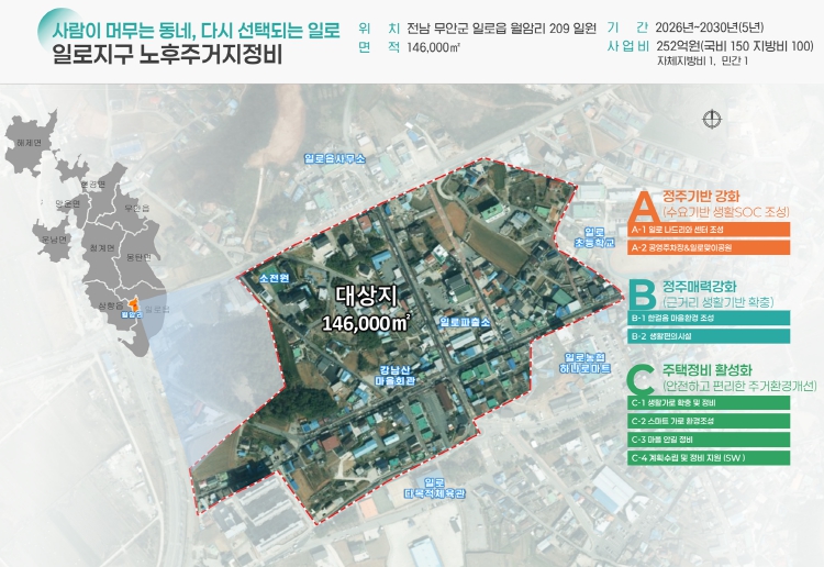 일로읍 월암리 일원 146,000㎡의 도시재생 활성화 지역에 2026년부터 2030년까지 5년간, 251억 원(국비 150, 군비 101)을 투입하여 일로 나드리와 센터, 공영주차장 & 일로맞이공원, 도시계획도로 개설, 마을주차장 조성 및 안길 정비, 집수리 지원 등을 추진하게 된다.