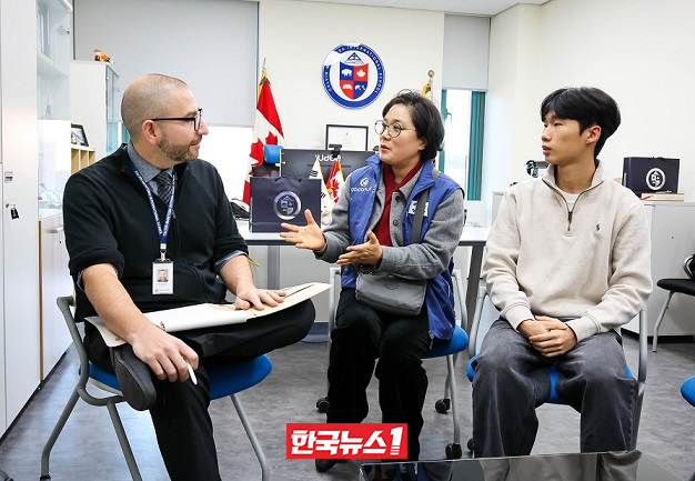 | ▲ 왼쪽 조쉬버클교장, 가운데 코코넛 서영란사무처장, 민준홍학생의 통역을 통해 대화하고 있다. |