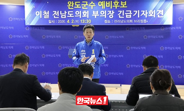 | ▲ 이철 완도군수 예비후보(전남도의회 부의장)이 전라남도의회 브리핑룸에서 최근 언론 보도와 완도군수 경선 후보 3인 사법리스크에 대해 기자회견을 하고 있다. |