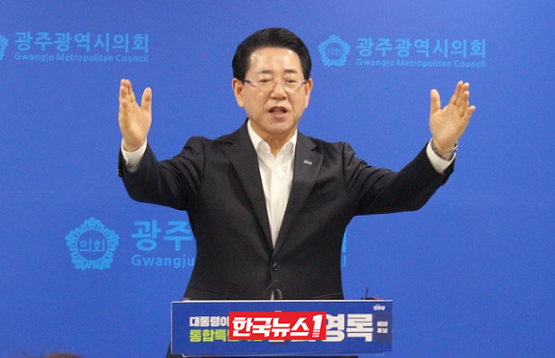 | ▲ 김영록 전남광주특별시장 예비후보가 6일 광주시의회 브리핑룸에서 기자회견을 열고 결선 진출 입장을 밝히고 있다. |